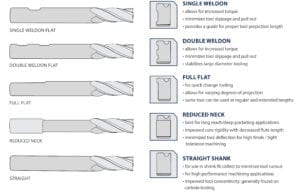 Determining the shank that will suit your needs best is an important element for improved machining and rigidity. In general, selecting the largest diameter will maximize rigidity and minimize deflection and chatter. Shank designs are targeted towards specific applications, therefore choosing the best shank for how your collet will hold the tool is essential. We offer a standard straight shank, single weldon flat, double weldon flat, full flat and reduced neck shanks. Specialty shank configurations are available on request.